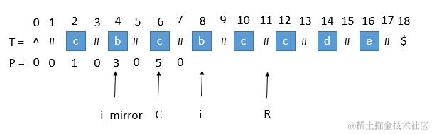 只要我们有了P这个数组我们就可以使用P数组求得原来数组的下标,用 P 的下标 i 减去 P [ i ],再除以 2,就是原字符串的开头下标了。但是我们怎么求得这个数组P呢?算法的最核心就在这,充分利用回文字符串的对称性,我们用 C 表示回文串的中心,用 R 表示回文串的右边半径。所以 R = C + P[ i ]。C 和 R 所对应的回文串是当前循环中 R 最靠右的回文串。让我们考虑求 P [ i ] 的时候,如下图。用 i_mirror 表示当前需要求的第 i 个字符关于 C 对应的下标。