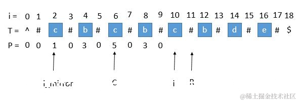 此时的 P [ i ] 求出来将会是 3,P [ i ] 对应的右边界将是 10 + 3 = 13,所以大于当前的 R,我们需要把 C 更新成 i 的值,也就是 10,R 更新成 13。继续下边的循环。思路就这样,我们直接上代码。