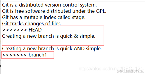 这里告诉你说readme.txt文件发生了冲突,你也可以使用git status指令查看发生冲突的相关文件,那我们知道冲突之后,我们需要怎么解决呢?很简单,首先我们在没有使用工具的情况下(比如idea等,idea提供了很强大的工具让我们配合使用git,这文章不是讲解idea的使用,所以这里就不多说了,以后有机会专门开工具篇再说),直接打开发生冲突的文件,一般会出现下图这样的情景: