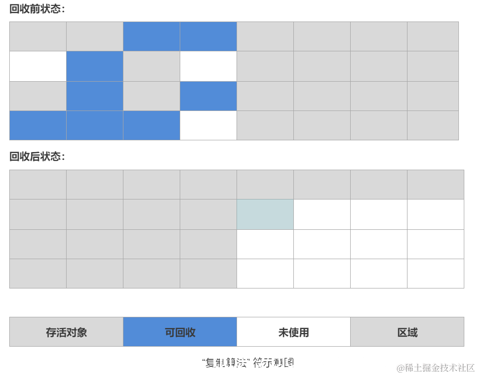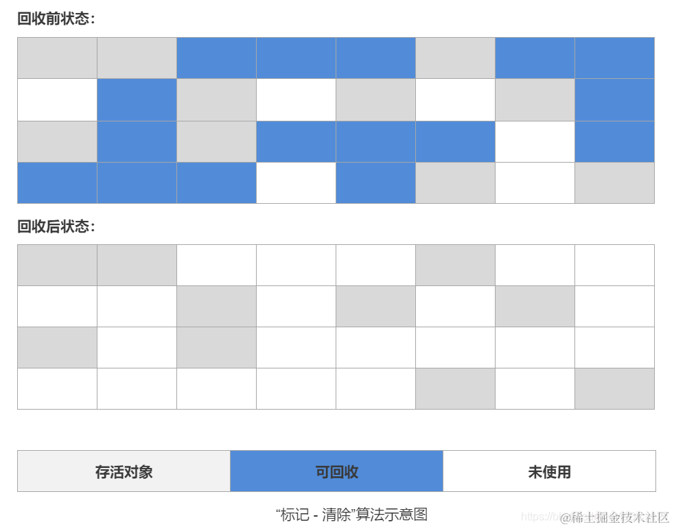 首先讲的是标记-清除算法,也是最基础的垃圾收集算法,我们看到它的名字就可以知道,算法分为两个阶段,分别是“标记”和“清除”两个阶段,首先标记出所有所有需要回收的对象,在标记完成之后,统一回收所有被标记的对象,至于如何完成对象标记,细节还是移驾另一篇文章JVM如何判断对象是否要回收。后面提到的收集算法,都是基于这个算法的思路并对其不足进行改进而得到的。