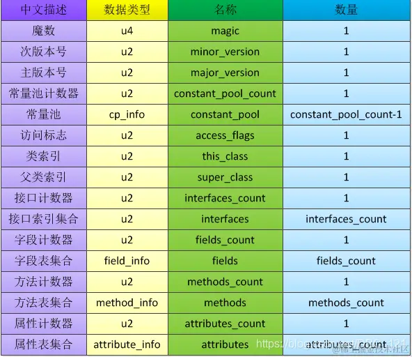 表是由多个无符号数或者其他表作为数据项构成的符合数据类型,所有表都习惯性地以“_info”结尾,表用于描述有层次关系的复合结构的数据,整个Class文件本质就是一张表,具体的基本数据项可以看下面这个图。
