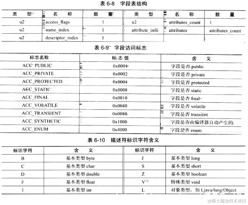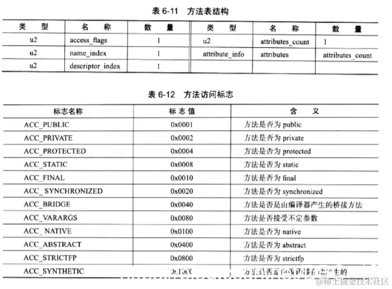 这里讲一些特殊的类型,数组类型,每一维度将使用一个前置的“[”字符来描述,如一个定义为“java.lang.String[][]”类型的二维数组,将被记录为“[[Ljava/lang/String”,一个整型数组“int[]”将被标记为“[I”。描述方法时,按照先参数列表,后返回值的顺序描述,参数列表的参数严格顺序放在一组小括号“()”之内,如方法void inc()的描述符为“()V”,方法java.lang.String toString()的描述符为“()Ljava/lang/String”,方法int indexOf(char[]source, int sourceOffset, int sourceCount, char[]target, int tarOffset, int targetCount, int fromIndex)的描述为“([CII[CIII)I”