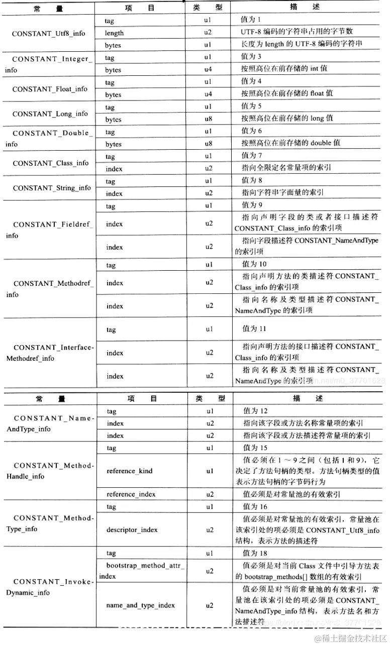 常量池中主要存放两大类常量:字面量和符号引用,字面量如文本字符串、声明为final的常量值,而符号引用则属于编译原理方面的概念,包含了类和接口的全限定名、字段的名称和描述符、方法的名称和描述符。值得一提的是,java代码在进行javac编译的时候,在虚拟机加载class文件的时候进行动态连接的,所以说在class文件中不会保存各个方法、字段的最终内存布局信息。因此这些字段、方法的符号引用不经过运行期转换的话无法得到真正的内存入口地址。虚拟机运行时,需要从常量池获得对应的符号引用,再在类创建时或运行时解析、翻译到具体的内存地址之中。常量池中的每一项常量都是一个表,大概如下