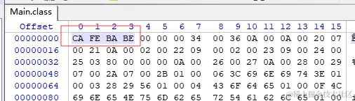 每个Class文件的头4个字节称为魔数。它的唯一作用是确定这个文件是否为一个能被虚拟机接受的class文件,可以这么理解,魔数是某个文件格式的标识,很多文件储存标准中,都是使用魔数来进行身份识别,比如图片格式,像gif、jpeg等在文件头中都存有魔数。使用魔数而不是拓展名来进行识别主要是基于安全方面考虑,因为文件拓展名可以随意的改动。所以如果你想要的一个自己的类型格式文件,你可以自由的选择魔数值(当然啦,不要和现有格式混淆),所以class文件的魔数是0xCAFEBABE,看下面图。