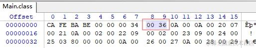 紧接着魔数的4个字节存储的是class文件的版本号,第5和第6个字节是次版本号,第7和第8个字节是主版本号。这里大概说一下java版本号的规则,java的版本号是从45开始的,JDK之后的每个JDK大版本发布主版本号向上加1(它之前的JDK1.0-1.1使用的是45.0-45.3),高版本的JDK能向下兼容以前版本的class文件,但不能运行以后版本的class文件,即使class文件格式没有发生任何变化,虚拟机也必须拒绝执行超过其版本号的class文件。我的是1.8