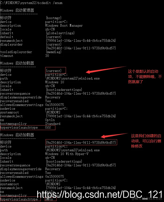 建立两个启动项,一个开启了 Hyper-V,而另一个则关闭,这样,我们可以在需要该功能时,在系统启动界面自由的选择相应的启动项,而不用频繁的安装和卸载 Hyper-V。启动项是啥意思?其实就是在我们开机的时候的一些默认设置,相当于我们在开机的时候选择系统一样,可以想象一下,我们在电脑中装有多个操作系统的时候,我们在开机需要选择我们想要进入的操作系统,而启动项也是一个意思,有多个启动项的时候,开机的时候会让我选择自己想要的操作系统进入。建立新的启动项,并将 Hyper-V 功能关闭,命令如下(注意了,在cmd命令行需要用管理员身份执行哦):
