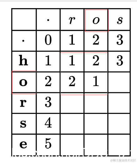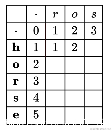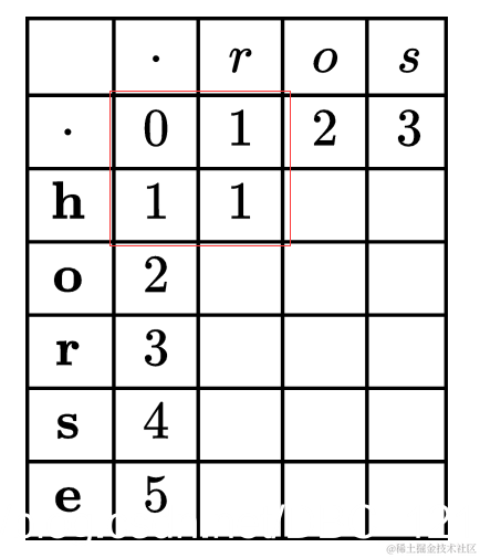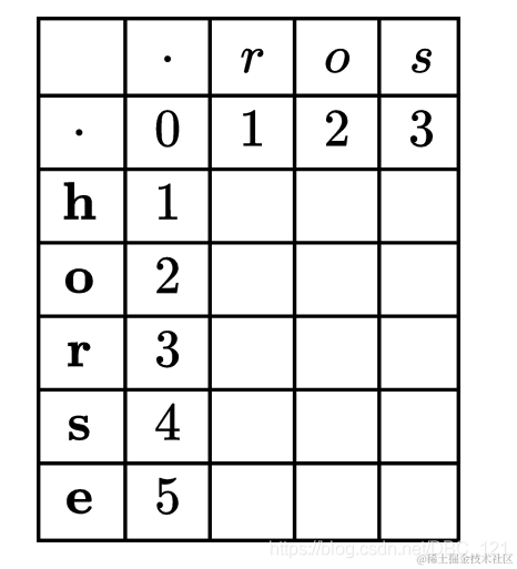 我们的目的是让问题简单化,比如说两个单词 horse 和 ros 计算他们之间的编辑距离 D,容易发现,如果把单词变短会让这个问题变得简单,很自然的想到用 D[n][m] 表示输入单词长度为 n 和 m 的编辑距离。具体来说,D[ i ][ j ] 表示 word1 的前 i 个字母和 word2 的前 j 个字母之间的编辑距离。