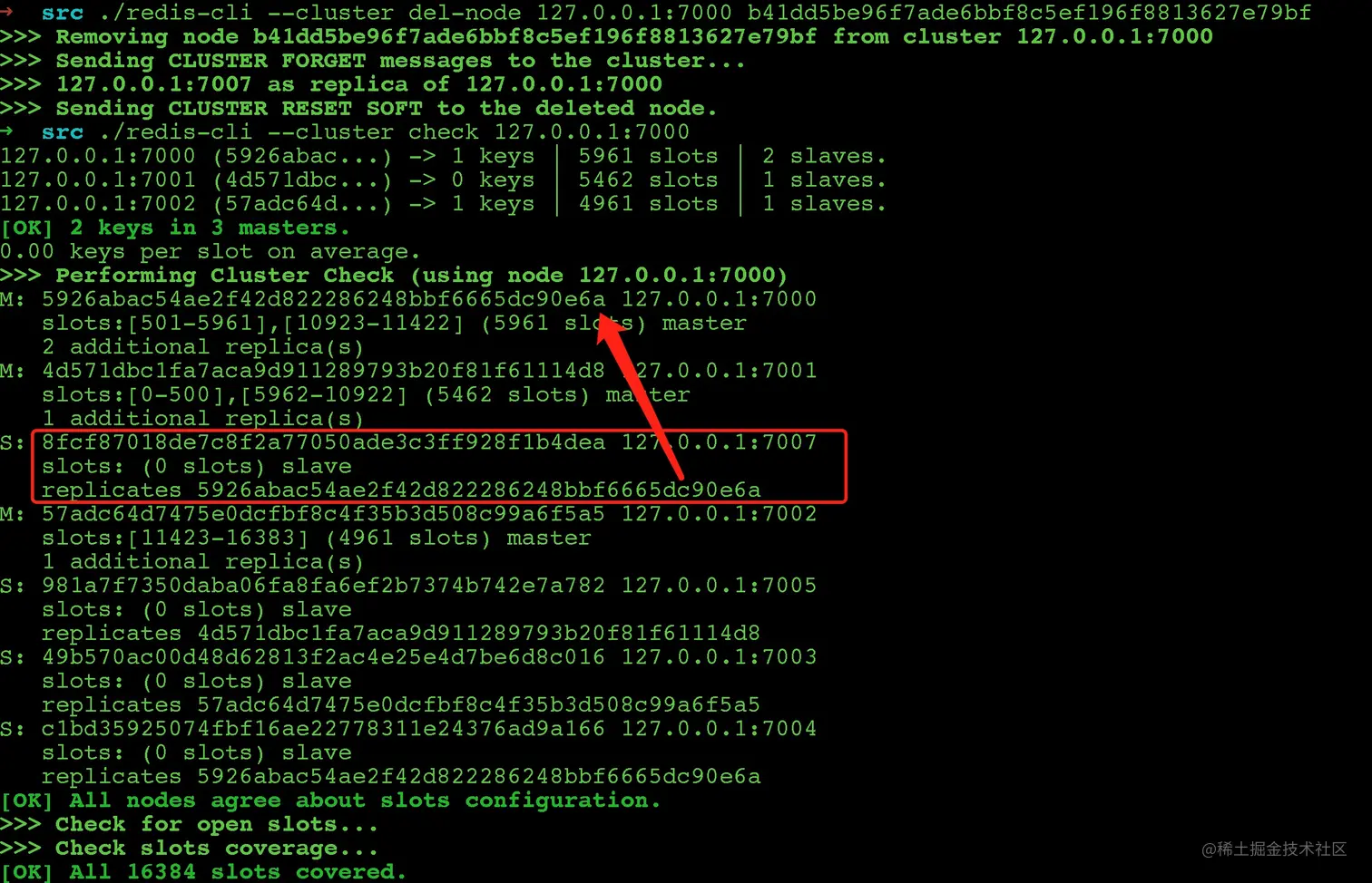 ➜ src ./redis-cli --cluster del-node 127.0.0.1:7000 b41dd5be96f7ade6bbf8c5ef196f8813627e79bf(删除节点对应的id)