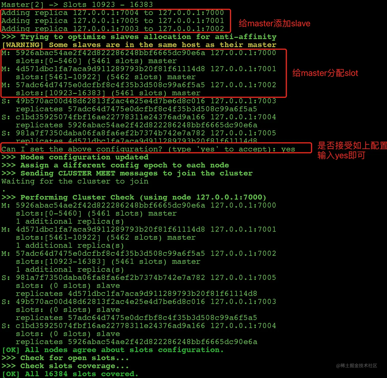 如上命令会创建3个masters和3个slaves,出现下图所示表明集群创建成功
