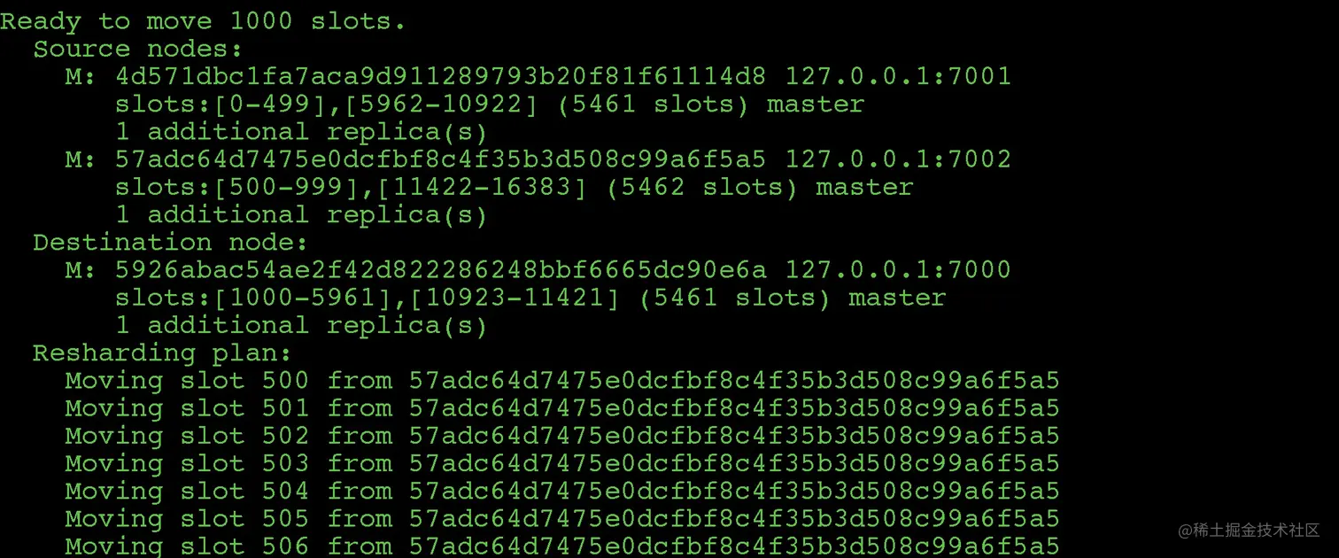 ➜ src ./redis-cli --cluster reshard 127.0.0.1:7000 --cluster-from 5926abac54ae2f42d822286248bbf6665dc90e6a --cluster-to 4d571dbc1fa7aca9d911289793b20f81f61114d8 --cluster-slots 500 --cluster-yes
