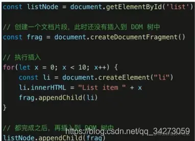 const listNode = document.getElementById('list') //创建一个文档片段,此时还没有插入dom const frag = document.createDocumentFragent(); //执行插入 for(let x = 0;<=10;x++){ const li = document.createElement('li'); i.innerHTML = 'list item'+x; frag.appendChild(li) } //都完成之后再插入dom树中 listNode.appendChild(frag)