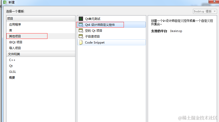 第一步:creator中新建-->其他项目--->Qt4设计师自定义控件。如图: