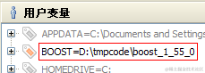 环境变量,用户变量组,新建变量名:BOOST(建议使用BOOST_ROOT更好),变量值:D:\tmpcode\boost_1_55_0