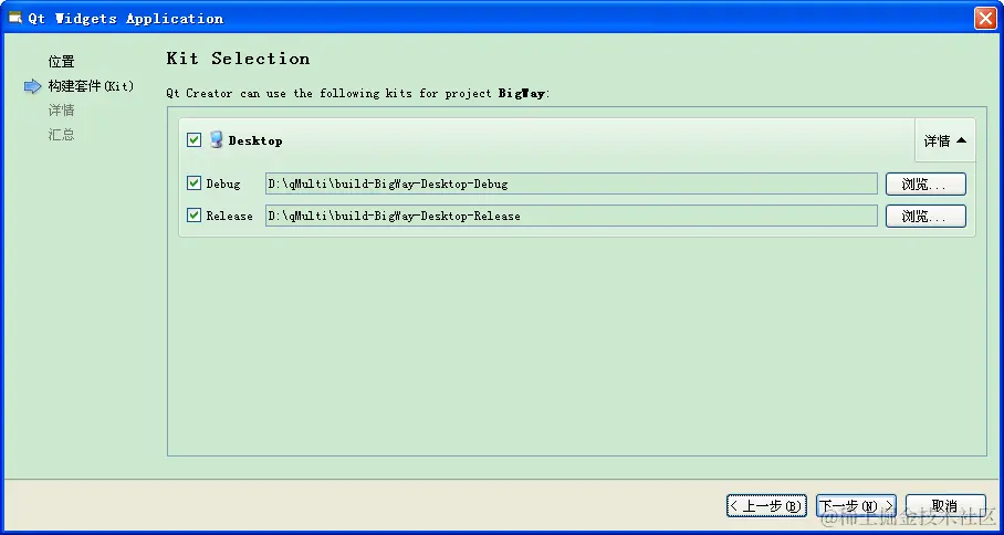 2、使用Qt Creator创建App应用程序:BigWay。注意:创建模板是App,存放路径是D:\qMulti