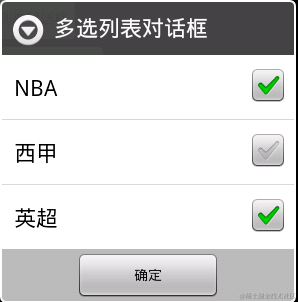 在多选按钮对话框中,我们用setMultiChoiceItems来设置多选按钮,这里setMultiChoiceItems中的参数为(CharSequence[] items, boolean[] checkedItems, OnMultiChoiceClickListener listener),第一个参数为要显示的条目的名称的数组,这里我们用一个String型的数组来存放,第二个是一个默认哪些按钮被选中的Boolean型数组,这里,我让下标为0和为2的条目默认被选中,当然,我们也可以事先定义好一个Boolean型数组。第三个参数就是点击多选按钮条目时的响应事件。在这个onClick事件中,同样有三个参数(DialogInterfacedialog, int which, boolean isChecked),第一个参数代表的是这个对话框,第二个参数代表的是String数组中存放的数值的下标值。第三个参数代表的是Boolean数组中的boolean值。当然我们也可以在列表对话框中增加button,这样也是可以的,我们当然也可以为这个button做响应事件。这里我就不多说了。