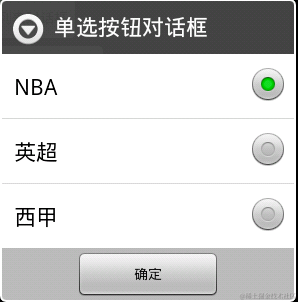 这样的参数,其中第一个参数是列表显示中的每一个条目的名称的数组,第二个是默认让哪一个条目被选择上,如上面的代码,我让第一条被默认选上,所以我就在checkedItem这个参数这里写上第一条在数组中的下标值0,如果我默认都没被选上,我就在这里写上-1,第三个是点击一个列表显示条目时的响应事件,所以在这里我们可以事先定义好一个数组来存放要显示的列表名称。这样在用时就方便多了。在条件点击影响事件时我们要实现onclick事件,这里也有一个参数which,它在API中的解释为which The button that was clicked (e.g. DialogInterface.BUTTON1) or the position of the item clicked.它和上面的which一样,也是代表一个唯一的数值。它在这里代表的是自己定义的那个存放列表名称的数组的下标值,因此我们可以通过下标来访问数组中的数值。在点击完我们可以设置让这个对话框消失,这里可以用dialog.dismiss();让对话框消失。当然我们也可以在列表对话框中增加button,这样也是可以的,我们当然也可以为这个button做响应事件。这里我就不多说了。