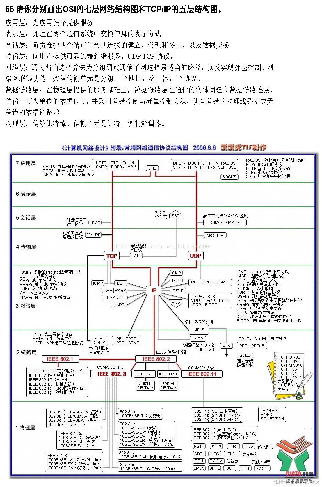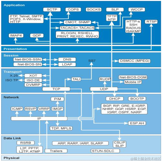 OSI七层网络结构图 firecat全宏 2021-05-18 113 阅读1分钟 \ \ \ \ 集线器属于一层设备,数据进来以后广播形式发送,对应OSI物理层。 交换机属于二层设备,根据MAC地址进行数据转发,他跟集线器不同于他每一个端口属于一个冲突域,而集线器所有端口属于一个冲突域,交换机对应OSI的数据链路层。 网桥属于二层设备,根据MAC地址进行帧转发,可以看做是2层路由,对应OSI数据链路层。 路由器是三层设备,根据IP进行寻址转发数据包,对应OSI网络层。\