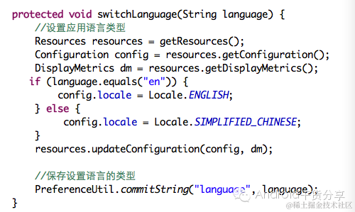 这会我们就用到第一步中保存的语言的类型了,在所有页面的基类BaseActivity中,每次都调用下语言设置的方法,这样就能把页面给强制设置成业务需求的语言类型了。OK,这个问题就完满解决了,要为你的APP添加这个功能的话,对代码的改动是非常小的。下面附上代码地址:github.com/JackCho/Swi…