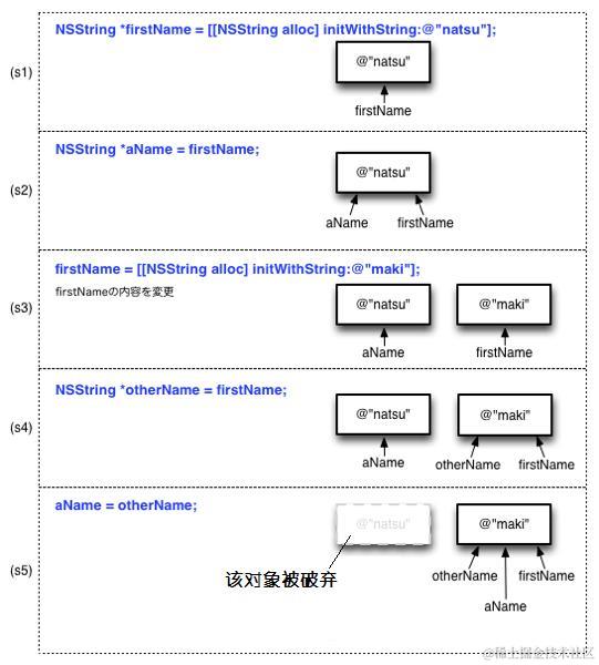 将otherName代入到aName,这时,aName将成为@”maki”字符串对象的持有者。而对象@”natsu”已经没有持有者了,该对象将被破弃。