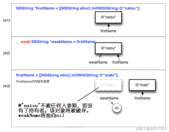 - 使用关键字__weak,声明弱参照weakName变量,将firstName代入。这时weakName虽然参照@”natsu”,但仍是Weak reference。即weakName虽然能看到@”natsu”,但不是其持有者。