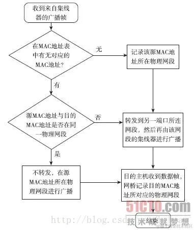 1)当网桥收到集线器的广播帧后,网桥会把帧中的源MAC 地址和目的MAC 地址与网桥缓存中保存的MAC 地址表进行比较。