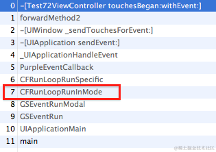 所以在UIApplicationMain中也是同样在不断处理runloop才是的程序没有退出。刚才的我说了NSRunLoop是一种更加高明的消息处理模式,他就高明在对消息处理过程进行了更好的抽象和封装,这样才能是的你不用处理一些很琐碎很低层次的具体消息的处理,在NSRunLoop中每一个消息就被打包在input source或者是timer source中了,当需要处理的时候就直接调用其中包含的相应对象的处理函数了。所以对外部的开发人员来讲,你感受到的就是,把source/timer加入到runloop中,然后在适当的时候类似于[receiver action]这样的事情发生了。甚至很多时候,你都没有感受到整个过程前半部分,你只是感觉到了你的某个对象的某个函数调用了。比如在UIView被触摸时会用touchesBegan/touchesMoved等等函数被调用,也许你会想,“该死的,我都不知道在那里被告知有触摸消息,这些处理函数就被调用了!?”所以,消息是有的,只是runloop已经帮你做了!为了证明我的观点,我截取了一张debug touchesBegan的call stack,有图有真相: