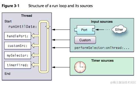 接下来看一下NSRunLoop具体的工作原理,首先是官方文档提供的说法,看图: