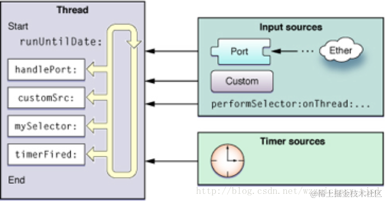 传递异步事件,通常消息来自于其他线程或程序。输入源传递异步消息给相应的处理例程,并调用runUntilDate:方法来退出(在线程里面相关的NSRunLoop对象调用)。