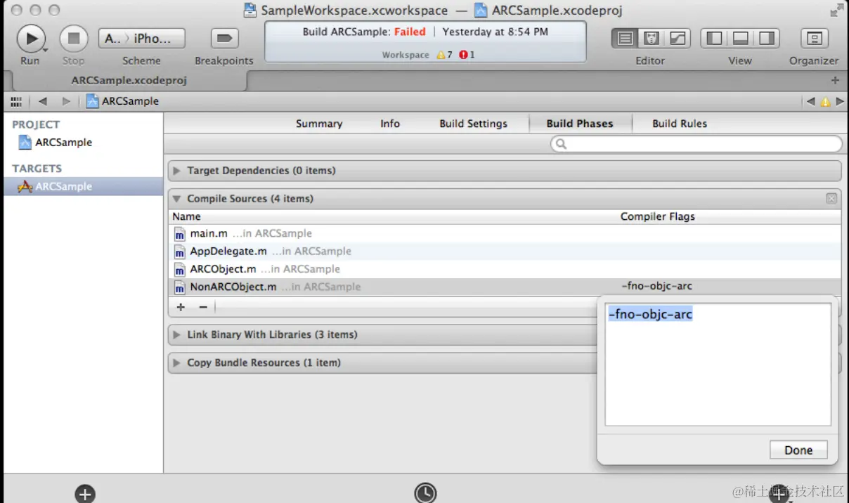 如果只想对某个.m文件不适应ARC,可以只针对该类文件加上 -fno-objc-arc 编译FLAGS,如下图。