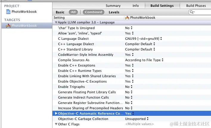 这个时候,可以将项目编译设置中的“Objectice-C Auto Reference Counteting”设为NO。如下所示。