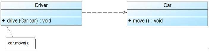 public class Driver { public void drive(Car car) { car.move(); } …… } public class Car { public void move() { ...... } …… }