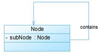 在系统中可能会存在一些类的属性对象类型为该类本身,这种特殊的关联关系称为自关联。例如:一个节点类(Node)的成员又是节点Node类型的对象,如图4所示: