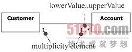 多重性元素(multiplicity element)主要包含一组上下限数,用来指出可被允许生成的实例(instance)数量,即最多可以生成多少数目(上限),最少不得低于多少数目(下限)。关联的两端以"下限..上限"的格式标示出多重性,如图2-12中的1..\*。星号(\*)代表无指定上限,下限最低为0。如果上下限数相同,标示出一个数目就可以了。因此,可以解读为: