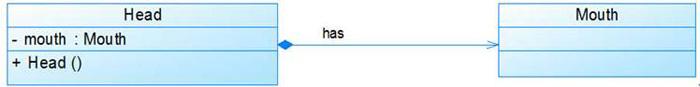 组合(Composition)关系也表示类之间整体和部分的关系,但是在组合关系中整体对象可以控制成员对象的生命周期,一旦整体对象不存在,成员对象也将不存在,成员对象与整体对象之间具有同生共死的关系。在UML中,组合关系用带实心菱形的直线表示。例如:人的头(Head)与嘴巴(Mouth),嘴巴是头的组成部分之一,而且如果头没了,嘴巴也就没了,因此头和嘴巴是组合关系,如图7所示: