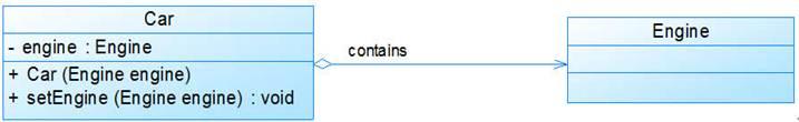 聚合(Aggregation)关系表示整体与部分的关系。在聚合关系中,成员对象是整体对象的一部分,但是成员对象可以脱离整体对象独立存在。在UML中,聚合关系用带空心菱形的直线表示。例如:汽车发动机(Engine)是汽车(Car)的组成部分,但是汽车发动机可以独立存在,因此,汽车和发动机是聚合关系,如图6所示: