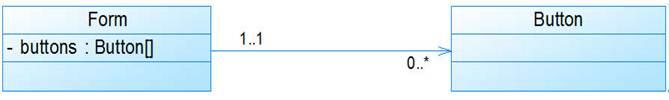 例如:一个界面(Form)可以拥有零个或多个按钮(Button),但是一个按钮只能属于一个界面,因此,一个Form类的对象可以与零个或多个Button类的对象相关联,但一个Button类的对象只能与一个Form类的对象关联,如图5所示: