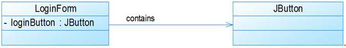 如在一个登录界面类LoginForm中包含一个JButton类型的注册按钮loginButton,它们之间可以表示为关联关系,代码实现时可以在LoginForm中定义一个名为loginButton的属性对象,其类型为JButton。如图1所示: