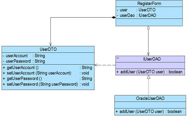 (1) 在RegisterForm中需要使用UserDTO类传输数据且需要使用数据访问类来操作数据库,因此RegisterForm与UserDTO和IUserDAO之间存在关联关系,在RegisterForm中可以直接实例化UserDTO,因此它们之间可以使用组合关联。