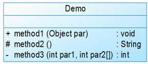 在类图2中,操作method1的可见性为public(+),带入了一个Object类型的参数par,返回值为空(void);操作method2的可见性为protected(#),无参数,返回值为String类型;操作method3的可见性为private(-),包含两个参数,其中一个参数为int类型,另一个为int\[]类型,返回值为int类型。