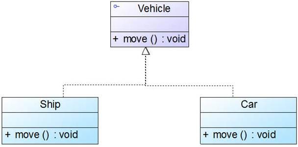 public interface Vehicle { public void move(); } public class Ship implements Vehicle { public void move() { …… } } public class Car implements Vehicle { public void move() { …… } }