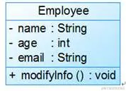 在UML中,类使用包含类名、属性和操作且带有分隔线的长方形来表示,如定义一个Employee类,它包含属性name、age和email,以及操作modifyInfo(),在UML类图中该类如图1所示: