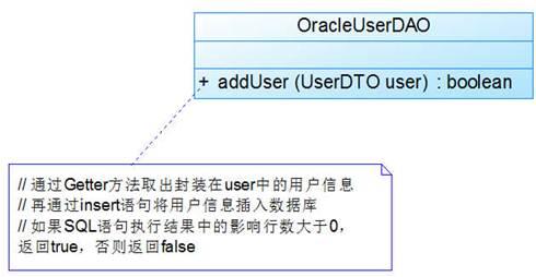 (4) 在声明IUserDAO接口的增加用户信息方法addUser()时,需要将在界面类中实例化的UserDTO对象作为参数传递进来,然后取出封装在UserDTO对象中的数据插入数据库,因此addUser()方法的函数原型可以定义为:public boolean addUser(UserDTO user),在IUserDAO的方法addUser()中将UserDTO类型的对象作为参数,故IUserDAO与UserDTO存在依赖关系。