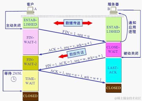 - 数据传输结束后,通信的双方都可释放连接.现在 A 的应用进程先向其 TCP 发出连接释放报文段,并停止再发送数据,主动关闭 TCP 连接(A 把连接释放报文段首部的 FIN = 1,其序号seq = u,等待 B 的确认)