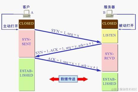 - A 的 TCP 向 B 发出连接请求报文段,其首部中的同步位 SYN = 1,并选择序号 seq = x,表明传送数据时的第一个数据字节的序号是 x