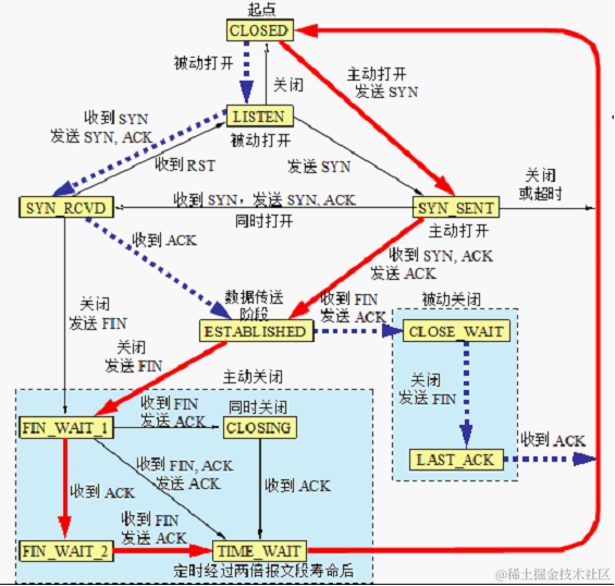 每个方框中的大写英文字符串是 TCP 标准所使用的 TCP 连接状态名.状态之间的箭头表示可能发生的状态变迁