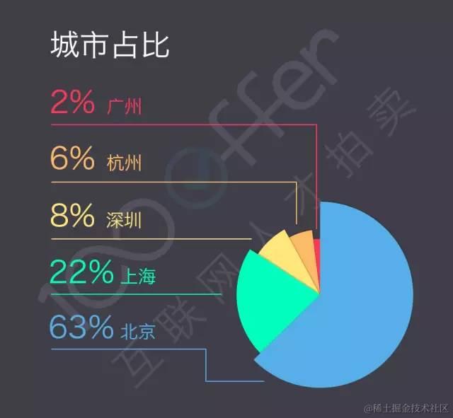本次数据样本包括北京、上海、深圳、杭州、广州五个城市的iOS开发候选人,北京占比过半,上海次之,广州最少。