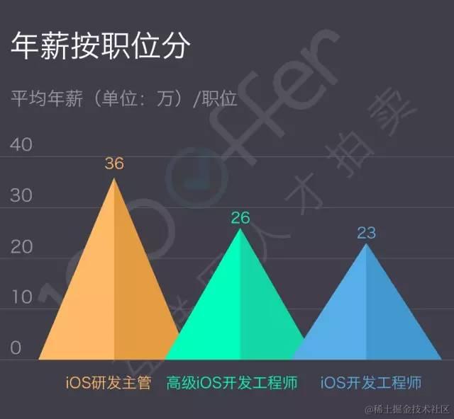 - 拥有4年以上iOS平台开发经验的工程师比较少。在BAT,一般是阿里的P7,百度T6,腾讯T3.2,年薪在50w左右;在创业团队,一般是iOS Tech Leader 研发主管,年薪根据所在公司的规模差别较大,一般在40w左右。不仅要求具备解决技术难题,带领技术团队的技术能力,还要求掌握前沿方向,把控业务的能力。