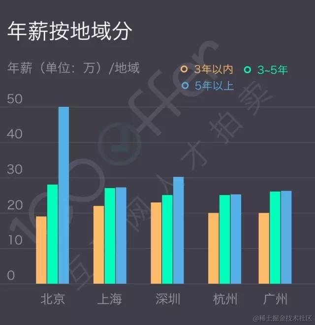 按照地域来看,北京的iOS开发工程师薪资水平最高,深圳其次,杭州略低。
