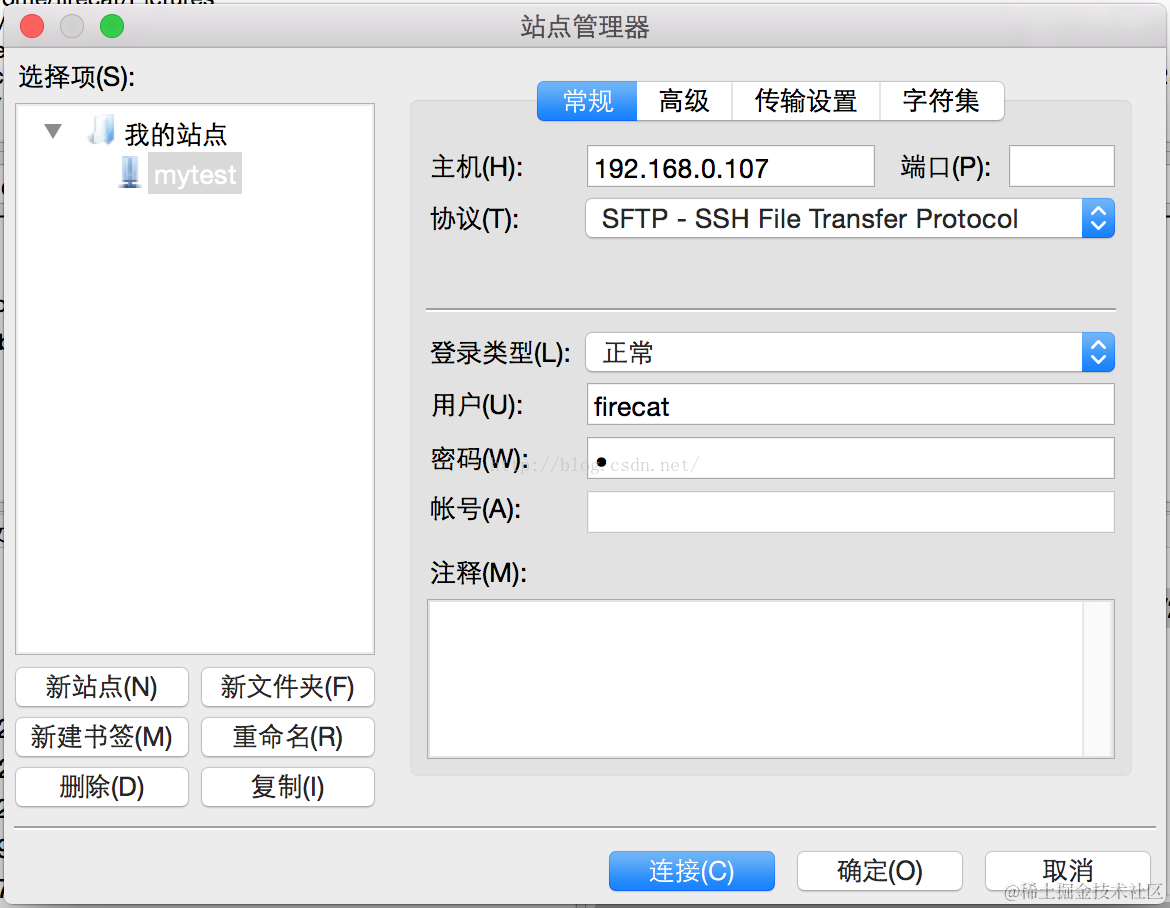 以下是客户端软件FileZilla的Mac版本截图,Mac作为客户端,Linux作为服务器,IP地址是192.168.0.107,SSH协议传输,端口22。