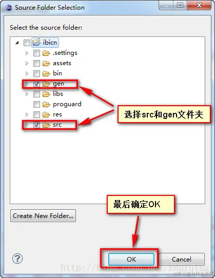 然后在弹出框中选中项目的src和gen目录,OK即可。如下图所示: